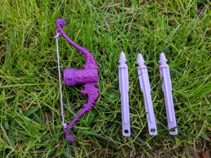 Además de la flecha que está dentro del arco, el empaque incluye dos flechas más, lo que da un par de oportunidades más de jugar sin tener que ir por la flecha ya disparada. Las tres flechas son iguales, todas del color mismo tono malva del top y la falda. El arco encaja bien en el brazo izquierdo de la muñeca pero no veo el caso de retirarlo, ya que Raven no puede hacer más poses con los brazos.
